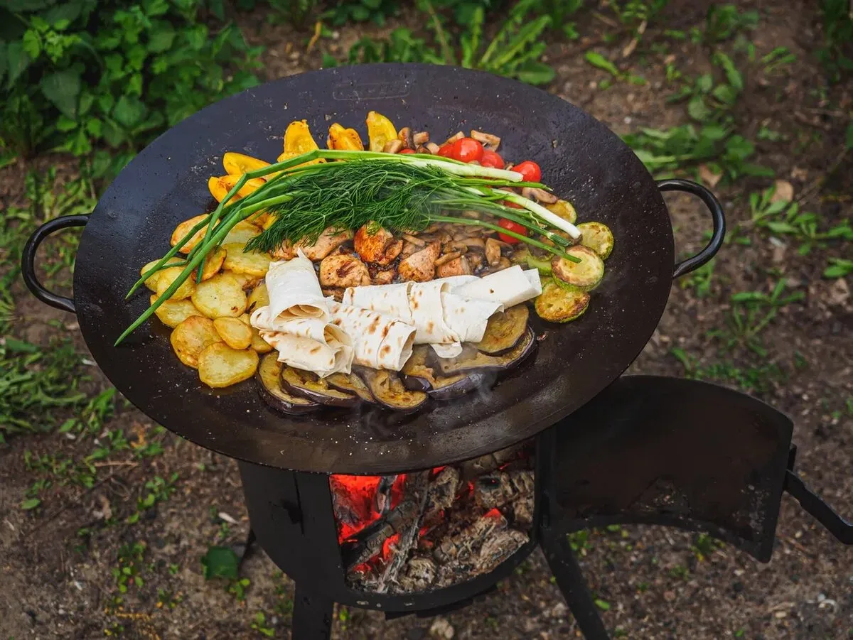 · Если вы планируете обзавестись чугунным вок, казаном или саджем, обратите внимание на их размеры, чтобы они могли удерживаться на выбранном вами учаге.
